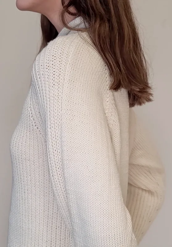 Das Hauptmuster der Rückseite ist glatt rechts, das Muster der Vorderseite ist tiefergestochenes Halbpatent. Es verleiht dem Pullover seine wunderbare Flauschigkeit und sieht ausserdem edel aus. Die Raglanschrägen entstehen durch betonte Abnahmen. Die Ärmel werden in zwei Hälften gestrickt, eine Hälfte in glatt rechts und die andere Hälfte im Halbpatentmuster. Alle Teile werden einzeln gefertigt und zum Schluss zusammen genäht. Der kurze Rollkragen wird direkt an der Halsborte angestrickt.